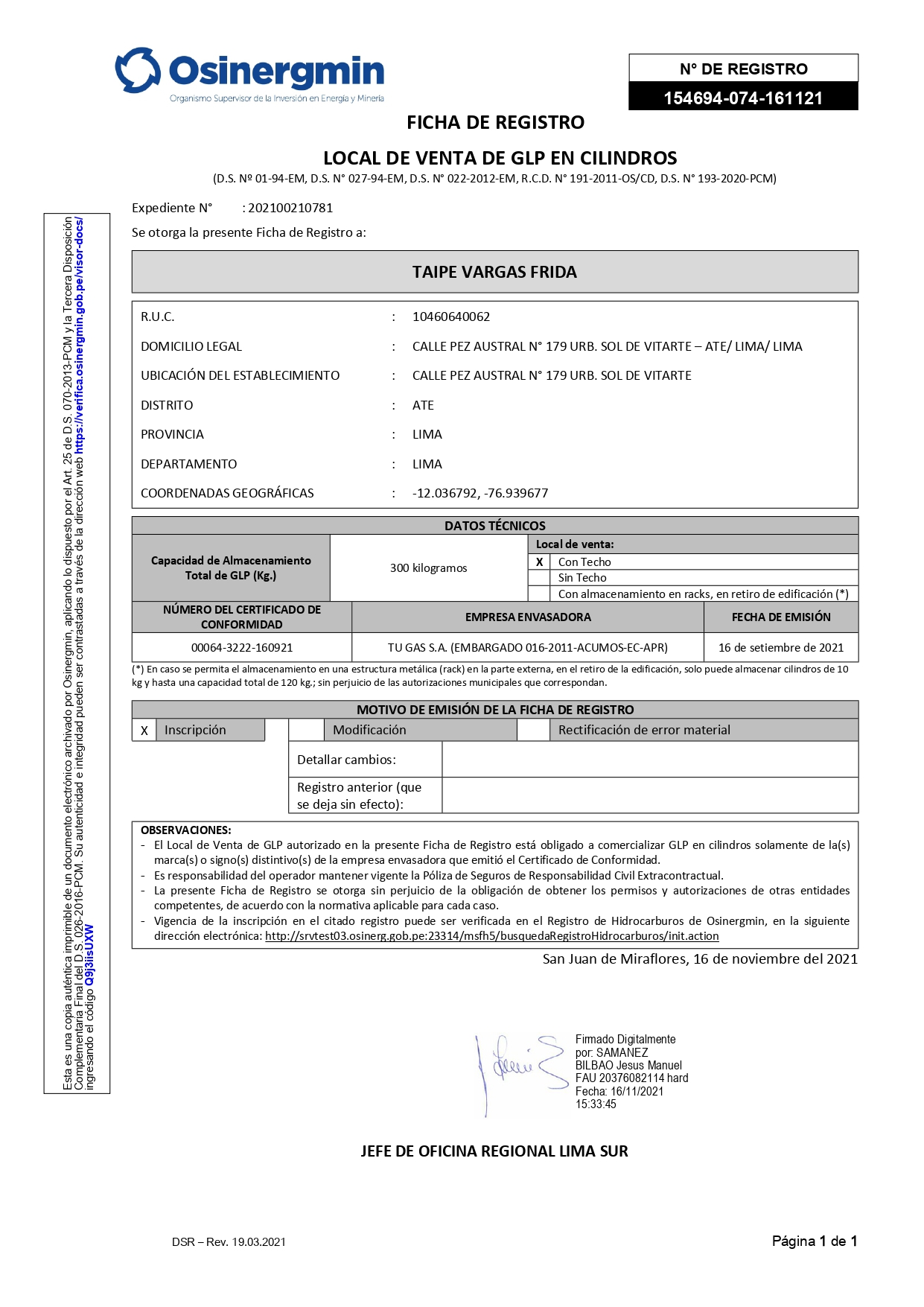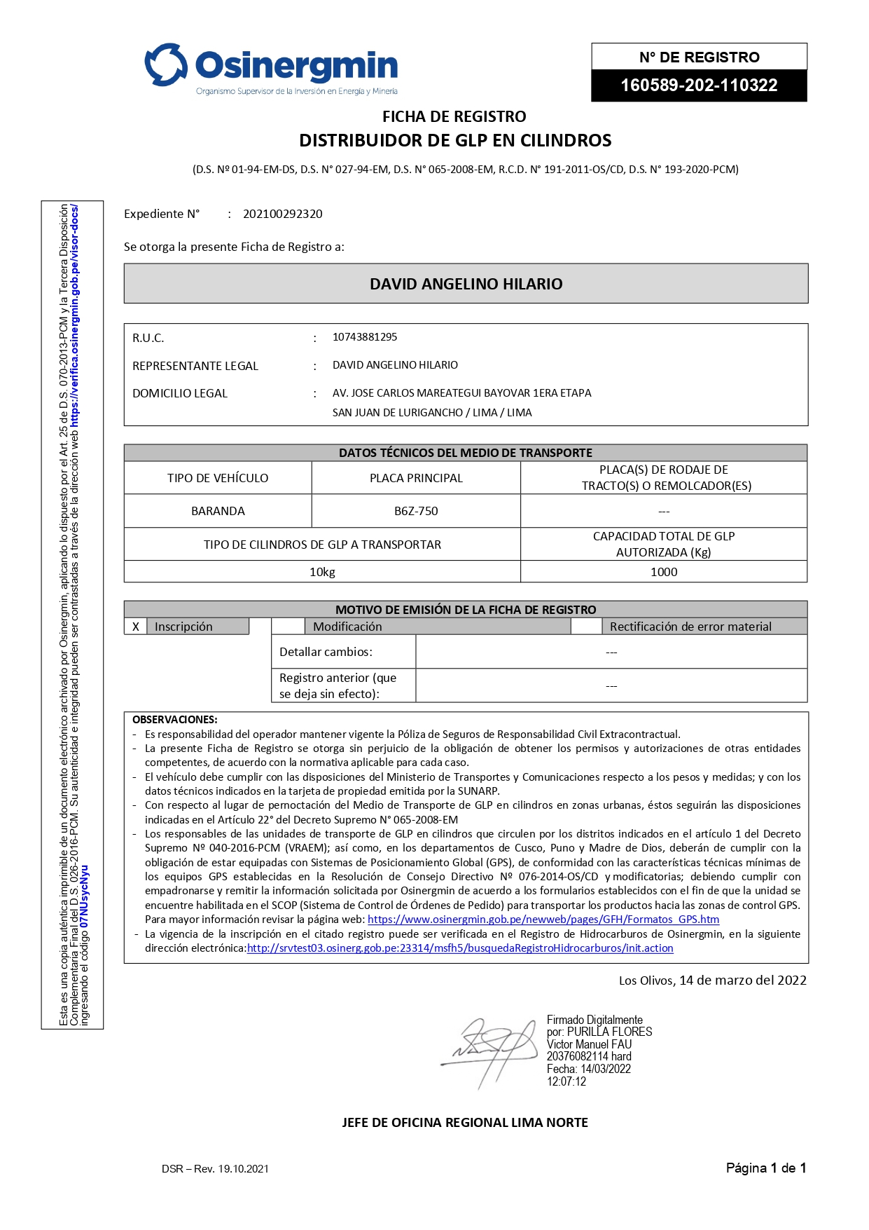 “Contacto gas tramito 2 permisos de mis camiones en Osinergmin y me dieron mis permisos”. Comentario del Sr. David Mendoza Álvarez de SG Seguro gas SAC desde el Distrito de Villa El Salvador Lima.