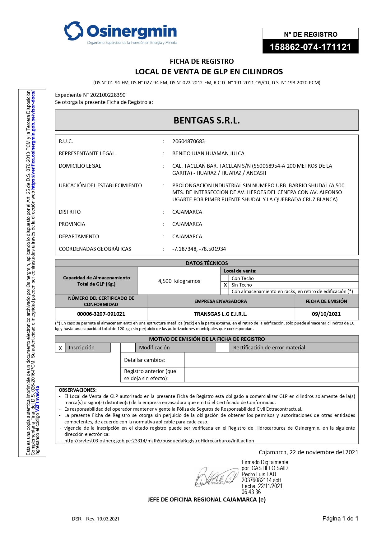 “Desde provincia confié en el Sr. Carbajal de la empresa Contacto gas y tramito mi permiso de Osinergmin para mi zonal de 450 cilindros y cumplió. Comentario del Sr. Benito Huamán Julca de BentGas SRL desde el departamento de Cajamarca.